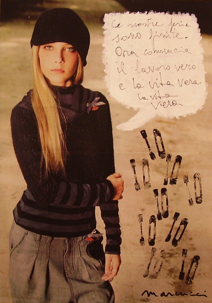 La vita vera 23 venerdì Lug 2021 Posted by Lucia Marcucci in Opere ≈ Lascia un commento TagArte Contemporanea, Contemporary Art, Lucia Marcucci, Poesia Visiva, Visual Poetry La vita vera (2011) | acrilici su tela stampata | cm 164×117 … © Riproduzione riservata Condividi: Fai clic per condividere su X (Si apre in una nuova finestra) X Fai clic per condividere su Facebook (Si apre in una nuova finestra) Facebook Mi piace Caricamento...