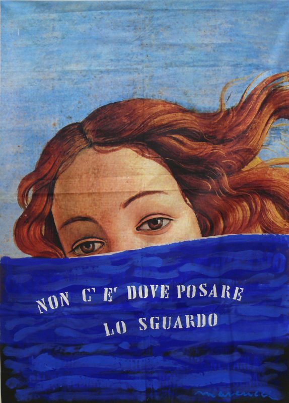 The incitement to consumption promoted by the mass media, with its invasive and alienating images, would have allowed Lucia Marcucci to create a new form of critical language through visual poetry, as explained by the artist herself: “The work visual poetry therefore does not arise from literature or painting but as an autonomous work of man’s conflict with the mass media”.