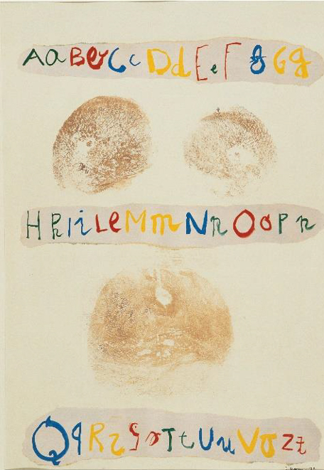 Since 1976 his works show traces of his physical presence with the addition of phrases or inscriptions made directly by hand, the mottos and images become more autobiographical or anthropomorphic. “Aa, Bb, Cc” (1977), from the “Impronte” series, was presented in the exhibition “Materializations of language” during the 1978 Venice Biennale. In this print, the alphabetical sample mixes with the imprints of the breasts and belly of the artist herself, alluding to the images of prehistoric Venuses and the iconography of the Mother Goddess.