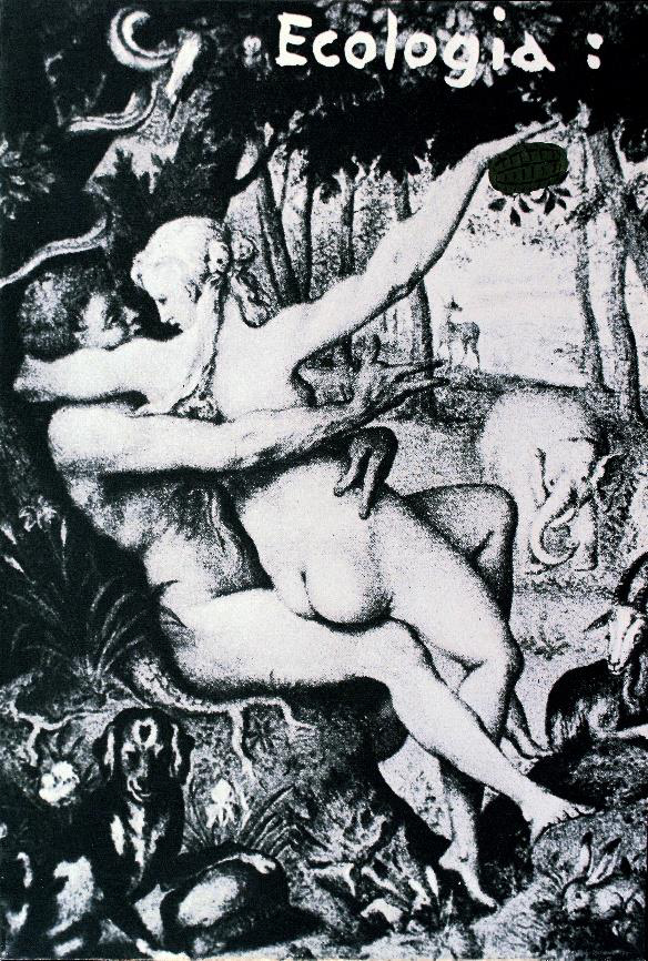 During the early seventies the artist, like other visual poets, experimented with the use of emulsion on canvas (a photographic transfer technique), often proposing images taken from the History of Art. The use of black and white and the total flatness or two-dimensionality of the image resulting from this technique makes the overlapping, or more often only the outline, of text and image more incisive. In “Ecology” (1973), Marcucci alters a painting by Daniel Fröschel depicting Adam and Eve, adding the title word and replacing the forbidden fruit with a drawn grenade, thus expressing his personal point of view on the impact of international comparisons concerning safeguarding the environment.