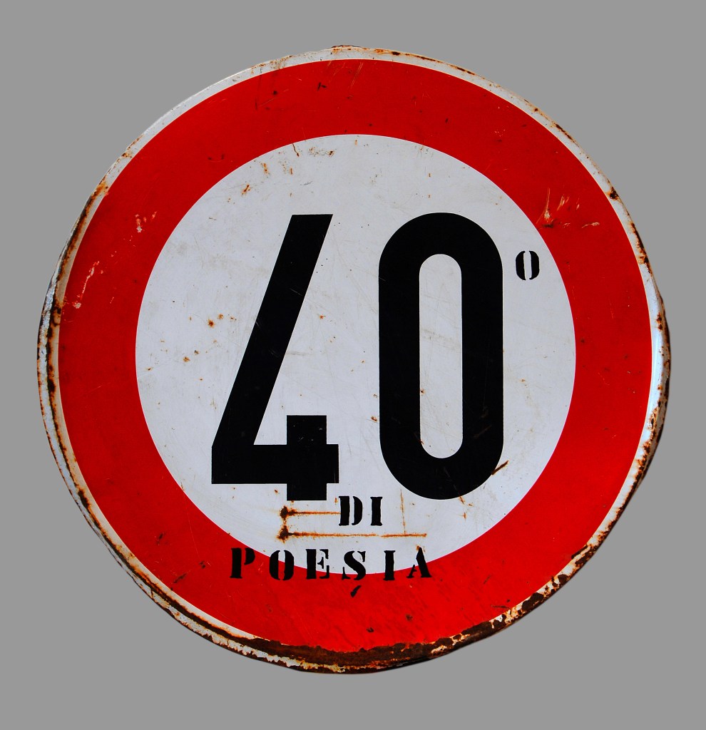 40° di poesia 27 mercoledì Lug 2022 Posted by Lucia Marcucci in Opere ≈ Lascia un commento TagArte Contemporanea, Contemporary Art, Lucia Marcucci, Poesia Visiva, Visual Poetry 40° di poesia (1966) | pennarello su cartello stradale | cm 60 Ø … © Riproduzione riservata Condividi: Fai clic per condividere su X (Si apre in una nuova finestra) X Fai clic per condividere su Facebook (Si apre in una nuova finestra) Facebook Mi piace Caricamento...