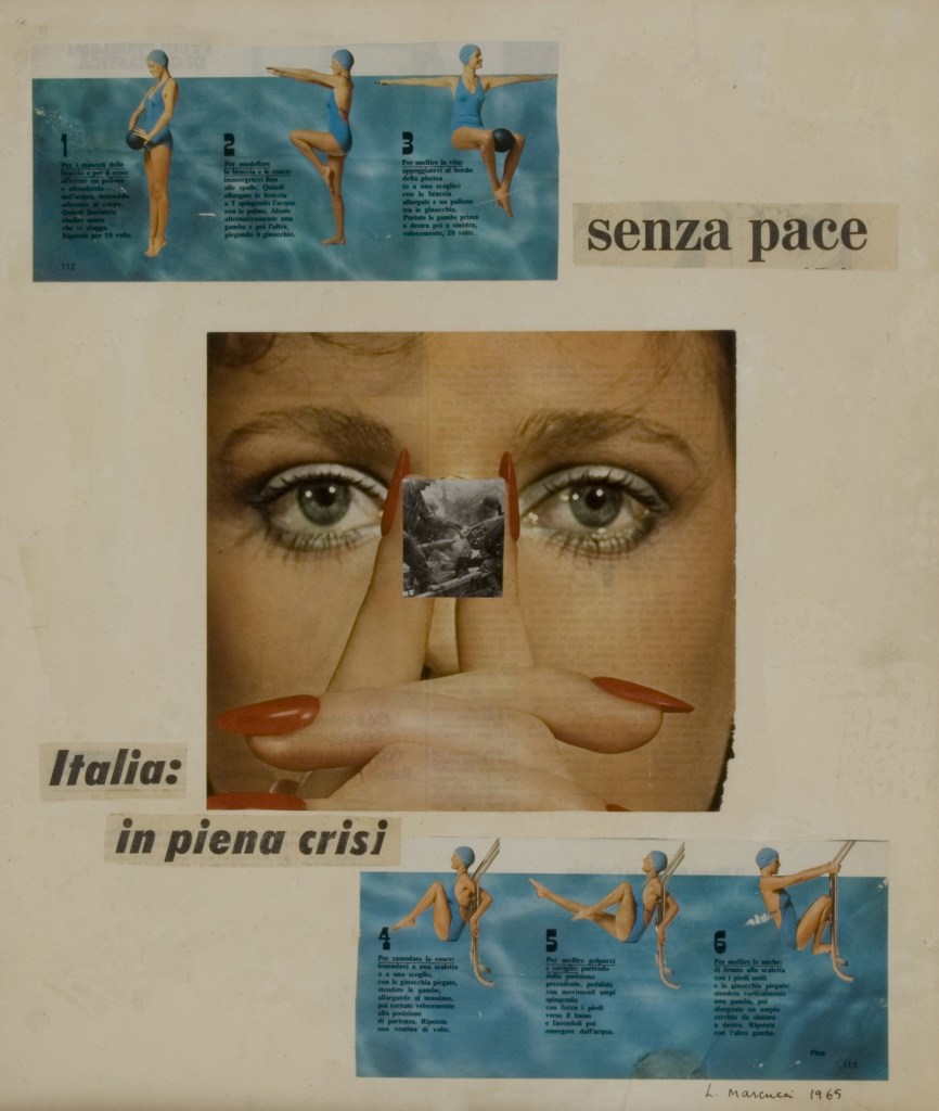 Curated by Sofia Gotti, the project borrows its title from Lucia Marcucci’s work, In Piena Crisi [In Full Crisis]. Marcucci, made poesia visiva [visual poetry] her core expressive language as co-founder of the Gruppo 70, active in Florence between 1963 and 1968. The titular collage crops images of water aerobics exercises alongside a portrait of a fully made-up woman whose manicured hands hold a nondescript photograph of War, probably in Vietnam. The collage’s tagline “without peace / Italy: in full crisis” captures Marcucci’s strategy to juxtapose images and text drawn from the mass media – her battleground for socio-political critique. Like Marcucci, the trailblazing graphic designer Armando Testa ran one of Italy’s largest ad agencies at the height of his career, while championing social battles such as the referendum for the legalisation of divorce in 1970.