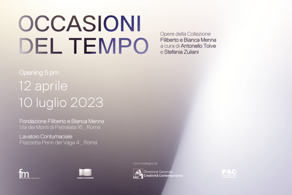 Nell’ambito del progetto del PAC2021 – Piano per l’Arte Contemporanea, la Fondazione Filiberto e Bianca Menna presieduta da Letizia Magaldi e il Lavatoio Contumaciale presieduto da Tomaso Binga, sono liete di annunciare Occasioni del tempo. Opere della Collezione Filiberto e Bianca Menna, l’importante esposizione che si terrà nella sede romana della Fondazione, già Archivio Tomaso Binga, in via dei Monti di Pietralata 16 e presso il Lavatoio Contumaciale, in Piazzetta Perin del Vaga 4, dal 12 aprile al 10 luglio 2023.