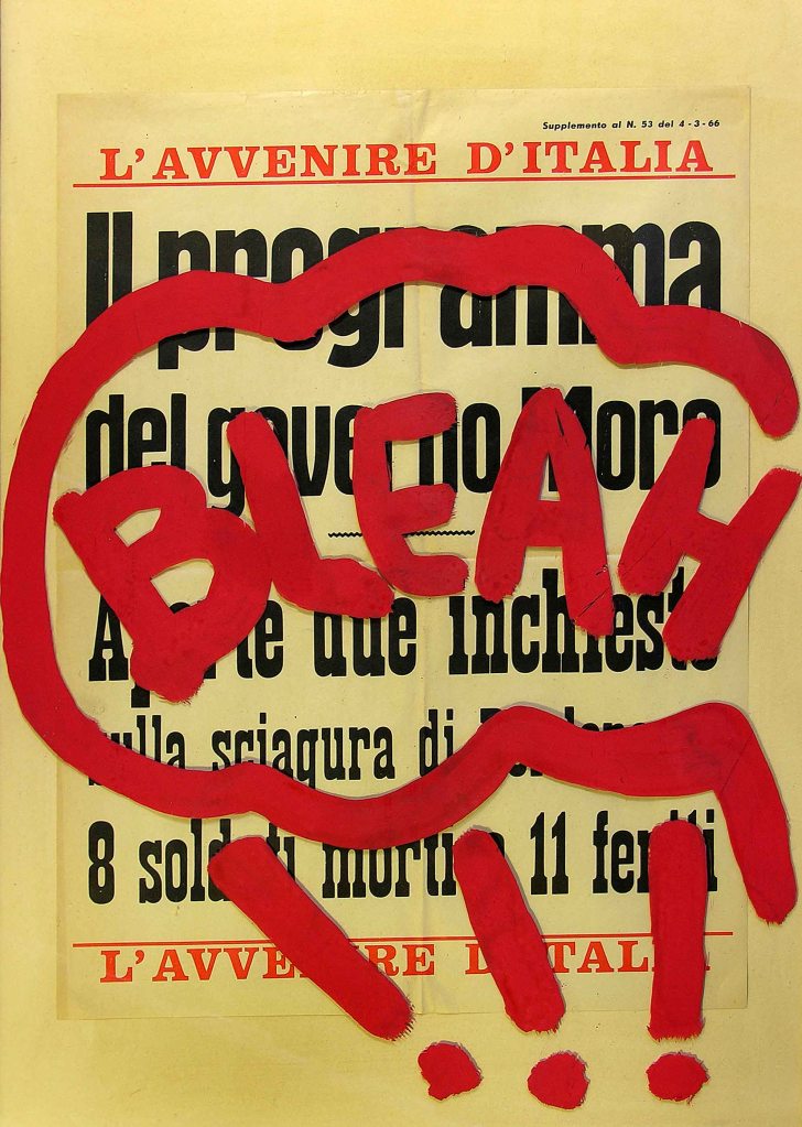 Lucia Marcucci stood out by virtue of her table-turning of the poetic word, which became part of the feminist struggles in the 1960s. What the artist defines as “returning the lexicon to the sender” means exploiting language with irony to pursue a critical redemption of stereotypes, of gender and the assumptions regulating representation of the female body, and of the forms and habits imposed upon it by capitalist society. The artist thus unveiled the nonsense and ideological emptiness underpinning mass communication, especially on topical issues. Bleah!!! (1967), a work on painted glass with a newspaper headline board, seemed to provide the only plausible answer at the time: one of outright dissent.